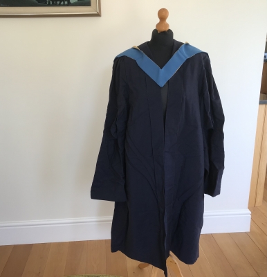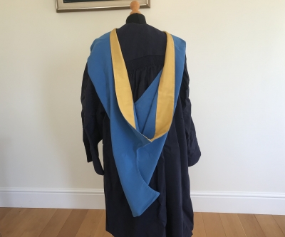 Suitable for graduate around 6' 2". Very dark navy blue with the Open University blue and gold hood. Worn once. Has small tear in the silk at the front although this doesn't show as it is underneath by the label. It seems that this is always a weak point when the hood is attached to a button. Price (Including Postage): £ 28.00