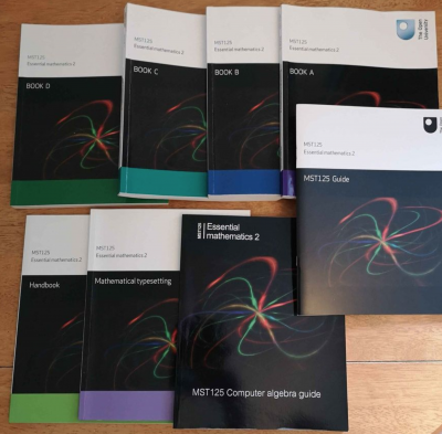 Study Books A-D; Computer Algebra Guide, Guide, Mathematical Typesetting Booklet, Handbook, MST125-Specimen Exam Paper & Solution MST125-Multiple Exam Papers + Answers MST125-Sample Exercise Booklets MST125-Sample TMAs MST125-Educative OU Videos in mp4 format easily playable on android, iPhone, iPad, Windows PC & Mac devices Price (Including Postage): £ 120.00